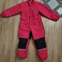Röd overall med ett mönster av små blommor och hjärtan. Overallen har en huva med rosa foder och dragkedja framtill. Det finns reflexdetaljer på ärmarna och benen.