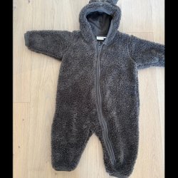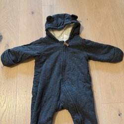Grå overall med ull från Lindex med luva och dragkedja framtill. Overallen har muddar vid ärm- och benslut.
