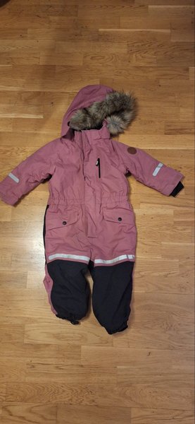 Rosa overall av märket kaxs med svart förstärkning på benen och avtagbar fuskpäls på luvan. Overallen har två fickor fram och reflexer på ärmar och ben.