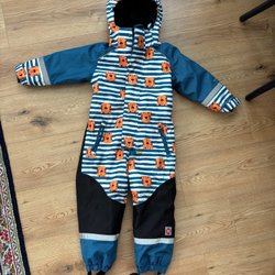 Overall med luva och dragkedja framtill. Den har ett mönster med olika djur.
