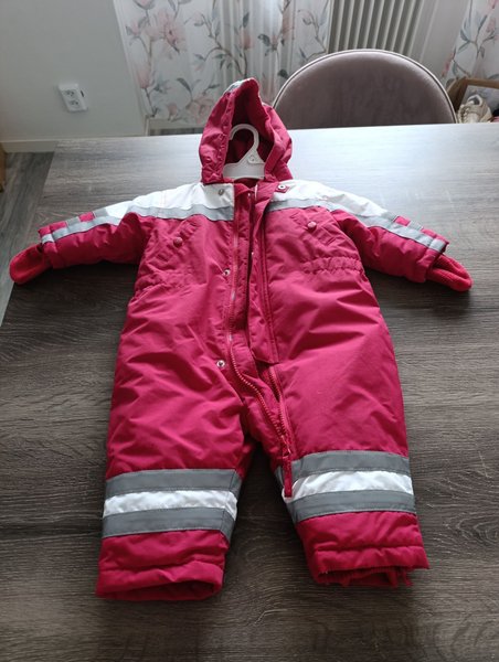 Röd och vit overall med huva och dragkedja framtill. Reflexdetaljer finns på ben och ärmar.