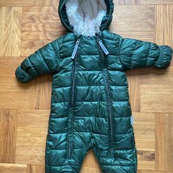 Grön overall med svart nedre del och svarta muddar. Overallen har en avtagbar huva och en dragkedja framtill. Det finns en ljusblå detalj på bröstet.
