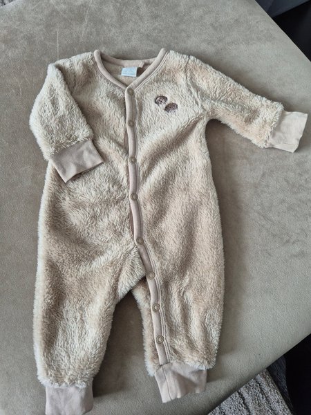 Mysig och mjuk onesie i beige färg med knappar framtill. Onesien har muddar vid ärmslut och benslut. På bröstet finns två söta igelkottar broderade.