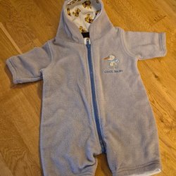Overall med huva och knappar framtill. Overallen har en dragkedja och en ficka med stickat mönster.