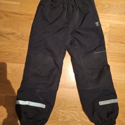 Svarta överdragsbyxor med justerbara hängslen och reflexdetaljer. Byxorna har dragkedja på sidan och "PO.P WEATHER PRO" tryckt på benet.