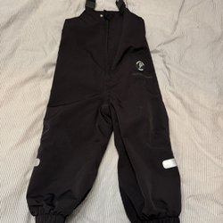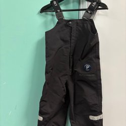 Svarta överdragsbyxor med hängslen och reflexer nedtill. Byxorna har förstärkta partier på knäna och bensluten.