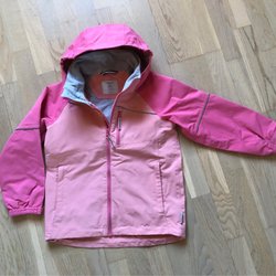 Skaljacka med dragkedja framtill och två fickor med dragkedja. Jackan har ett randigt mönster i rosa och vitt.