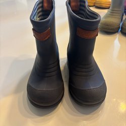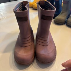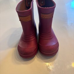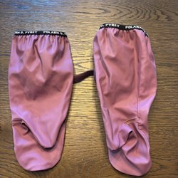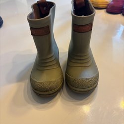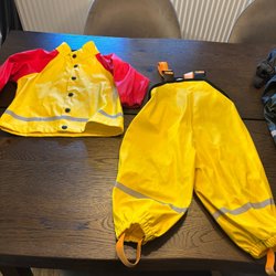 Regnställ för barn bestående av en regnjacka och ett par regnbyxor. Jackan är olivgrön med en huva och knappar framtill. Byxorna är orangea med hängslen och resår i bensluten. Storlek 80. Är som 86 -92 då de är väldigt stora. Fint skick
