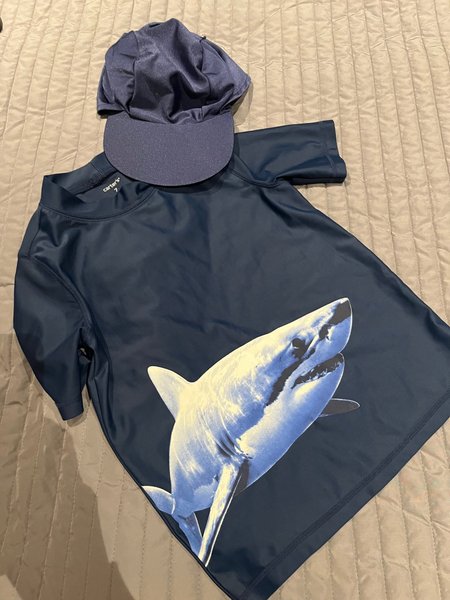 En badtröja med en haj på framsidan (strl 7) och mörkblå keps strl M.