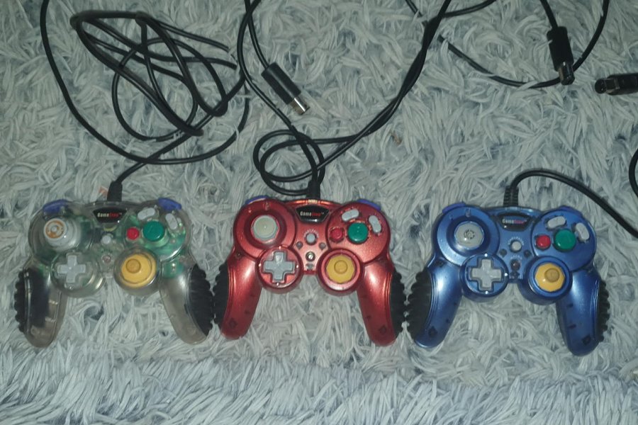 Tre GameStop GameCube-kontroller i färgerna transparent, röd och blå. Kontrollerna har sladdar.