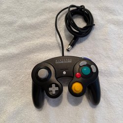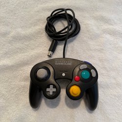 Nintendo GameCube handkontroll i svart färg. Kontrollen har en kabel för anslutning till konsolen.