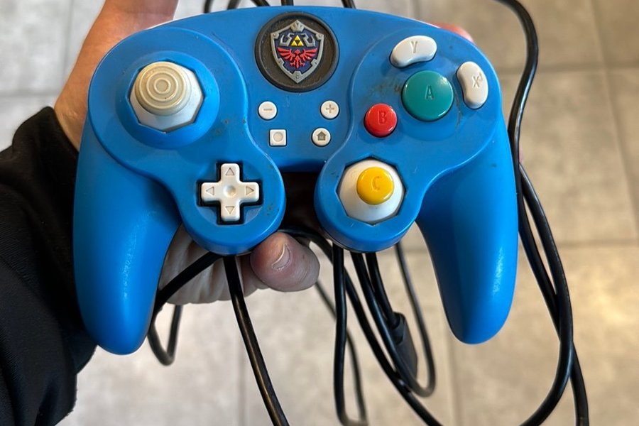 Nintendo Switch GameCube handkontroll i blått. Kontrollen har en Zelda-logotyp i mitten.