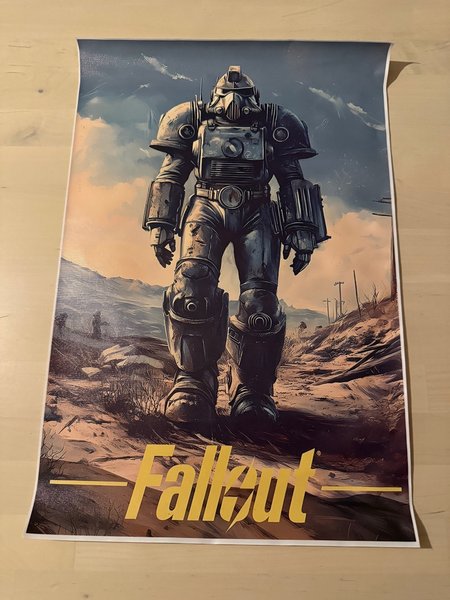 Canvasduk med motiv från Fallout. Föreställer en karaktär i rustning i ett ökenlandskap. Storlek ca 30x45 cm, Samfraktar gärna flera objekt.