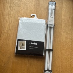 Fyrkantig modell med band i varje hörn som du använder för att fästa sänghimmeln i taket. Bandföljare som gör att du kan knyta upp tyget på olika sätt. Mått 200×200×250 cm.