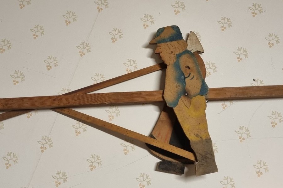 En gammal dragleksak i trä. Den föreställer en man med en yxa på ryggen. Hjulet är rött.