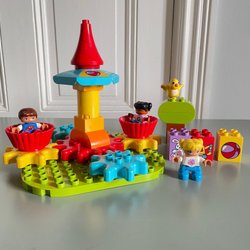 Sæt med LEGO Duplo klodser, figurer og køretøjer. Perfekt til små hænder og fantasifuld leg.