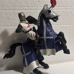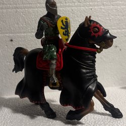 En leksaksriddare till häst med vapen och sköld. Perfekt för lek eller samling.