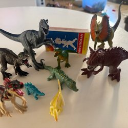 Ett parti med dinosauriefigurer. Innehåller flera olika dinosauriearter i varierande färger och storlekar. Lämpliga för lek.