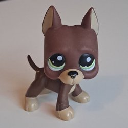 LPS hund. Denna leksak är en del av Littlest Pet Shop-serien och föreställer en tax. Den har bruna öron och en vit fläck i ansiktet.