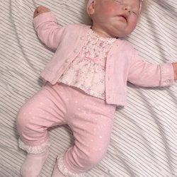 Reborn docka med kläder. Dockan har blont hår och stängda ögon. Kläderna består av en rosa klänning med rävtryck och matchande byxor.