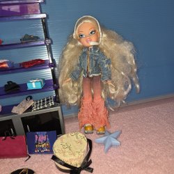 Bratz docka med kläder och skor. Dockan är märkt TM & © 2001 MGA i nacken och TM & © 2010 MGA Entertainment China på ryggen.