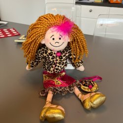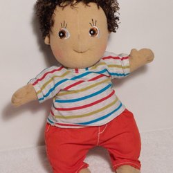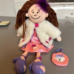Docka med två ansikten med olika uttryck. En sida sovande och andra sidan vaken. 60 cm lång. Ej Ce-märkt. Ej lekt med endast använd som prydnad.