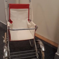 En charmig retro dockvagn med röd klädsel och kromad ram. Perfekt för samlare eller som en dekorativ detalj i barnrummet. Inkluderar en liten leksaksmobil. Kan avhämtas i Simrishamn eller Lomma.