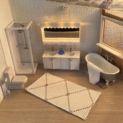Badrumsinredning för Lundby dockhus. Inkluderar kommod med dubbla handfat och spegel med hyllor på sidorna, samt med fungerande belysning överst. Luckor med jalusidörrar. En modul med bidé och handdukar, toalett, badkar (munstycket till duschen saknas), en stor grön växt, badrumsvåg, en matta och två flaskor.