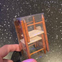 En miniatyr stol med grå sits. Perfekt för dockskåpet eller miniatyr samlingen. Se bilder för detaljer och mått.