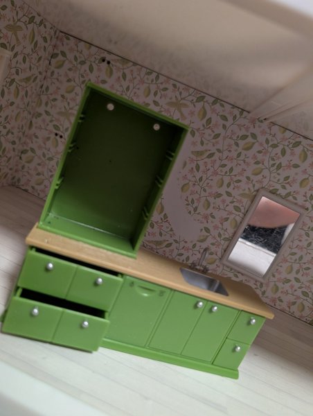 Ett charmigt dockskåpskök från Lundby. Köket har diskho, skåp och lådor.