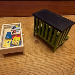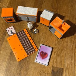 Möbler för ett dockskåp. Inkluderar en soffa, en fåtölj, ett bord och en matta.