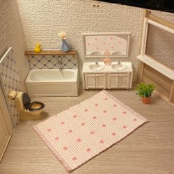 Lundby badrum med badkar, handfat, toalett och dusch. Inredning för dockskåp.