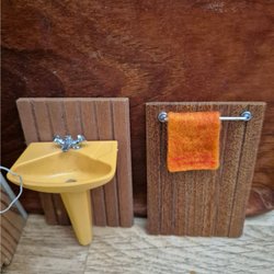 Badrumsmöbler för dockskåp. Setet inkluderar ett badkar, ett handfat med spegel och en toalett. Möblerna är tillverkade i trä.