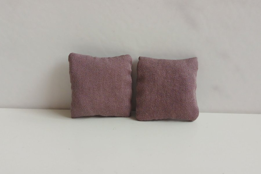 2 st kuddar i färgen lila. Passar till Lundby dockhus. 3×3 cm.