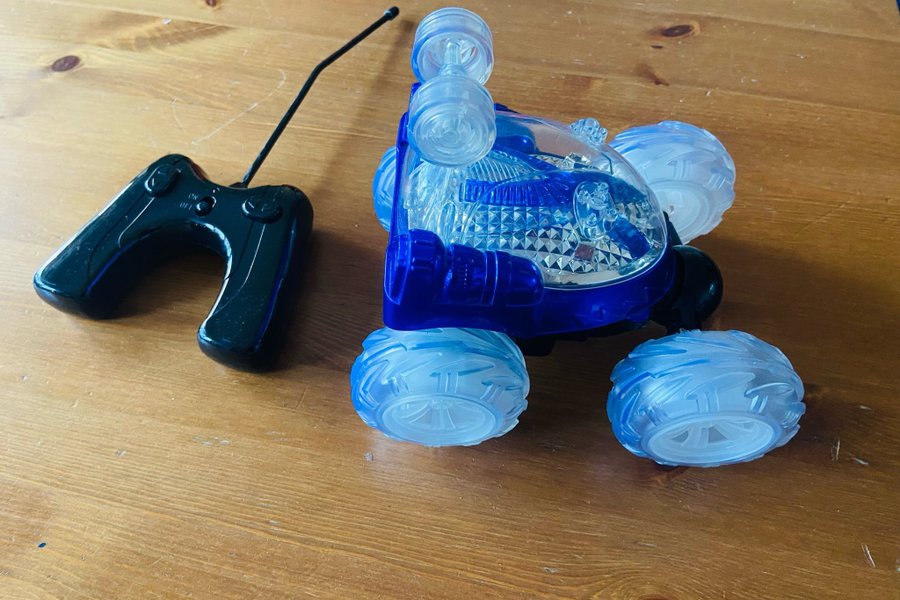Radiostyrd stuntbil med ljus och tillhörande kontroll. Bilen är blå och har genomskinliga däck.