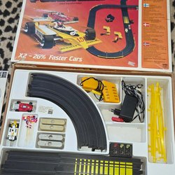 Tycko bilbana Här finns allt för att kunna bygga ihop en bana och köra. Bandelarna behöver rengöras vilket görs enkelt. Kolla in länk längre ned. Bilarna fungerar som de ska men Ferrari bilen behöver nya däck. Finns att köpa på https://www.barnochlek.se/index.php