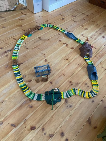 Flexitrack bilbana med dinosaurietema. Innehåller broar, grottor och burar. Grinden på mitten vid buren är trasig. Bilen är spårlöst borta- uppäten av en dinosaurie kanske. Stenbumlingen vid fågelberget rullar vidare någon annanstans och är ej återfunnen.