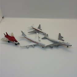Leksaksflygplan i rött och vitt. Mäter cirka 15 cm i längd. Ljud och ljus fungerar. Vingarna kan fällas in