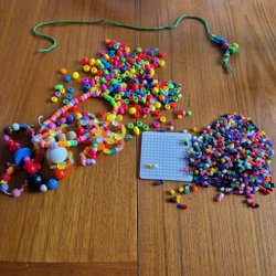 Stor samling av pärlor i olika färger. Inkluderar en burk Pyssla från IKEA, en hink från Biltema och två hinkar ”A world full of pearls” pärlor. Det finns också andra märken pärlor blandat i de stora hinkarna. Över 50 000 pärlor totalt! Ikea burken är oöppnad.