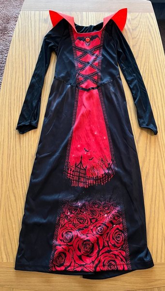 Svart och röd vampyrinspirerad klänning med långa ärmar. Klänningen har en röd krage och ett motiv nedtill. Storlek 8-10 år, uppskattar den till en 134. Jättefint skick.