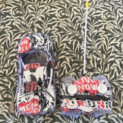 Nerf Nitro leksakspistol med tillbehör. Leksakspistolen är vit, grå och orange med flammönster. Den har en avtagbar orange ramp.