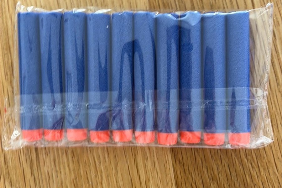 Detta är ett 10-pack med Nerfskott. Pilarna är blå med orange spetsar och kommer i en förseglad förpackning.