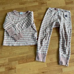 Ett par laxrosa/aprikosa fritidsbyxor med svarta detaljer. Byxorna har fickor med dragkedja framtill och förstärkta knän. Knappt använda i storlek 100