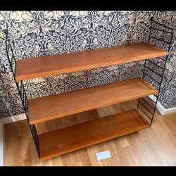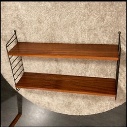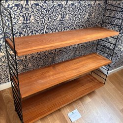 Klassisk stringhylla med ett hyllplan i trä, en svart tidningshylla/tidskriftshylla och svarta gavlar. Perfekt för förvaring och dekoration i hemmet.