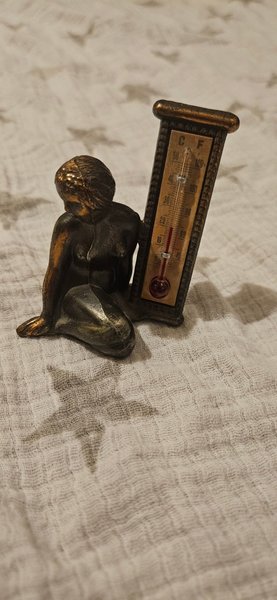 Dekorativ termometer med en sittande kvinnofigur. Visar både Celsius och Fahrenheit.