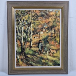 Ett tryck med motiv av tre figurer i sjömanskläder med djurhuvuden stående framför en båt. Trycket är i svartvitt.