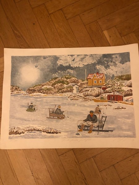 Konsttryck med motiv av vinterfiske. Trycket är signerat.