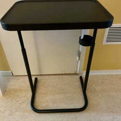 Laptopställ i svart färg. Stället är hopfällbart för enkel förvaring och transport. Det levereras med en grå tygpåse.