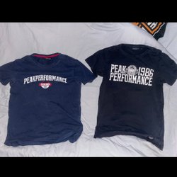 Två röda t-shirts med tryck av Bauhaus och Blodomloppet. Baksidan har tryck av GeBlod och Årets viktigaste lopp, samt flera andra logotyper. Både för 80 kr.