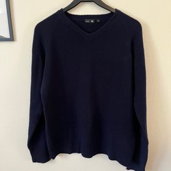 Svart V-ringad tröja med en liten Tommy Hilfiger-logga på bröstet. Tröjan har en ribbstickad krage, muddar och nederkant. Det finns en liten reva på högra axeln, jag har lagt till en bild på den.